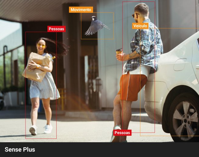 O dispositivo de segurança com Sense Plus detecta alterações nos quadros de vídeo captados através de algoritmos, destacando pessoas, veículos e animais em caixas de deteção para uma análise mais precisa. Dispara alertas e inicia a gravação de forma automática e autónoma.