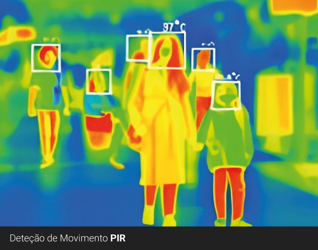 A Deteção de Movimento PIR (Infravermelhos) deteta alterações no ambiente através de mudanças térmicas.