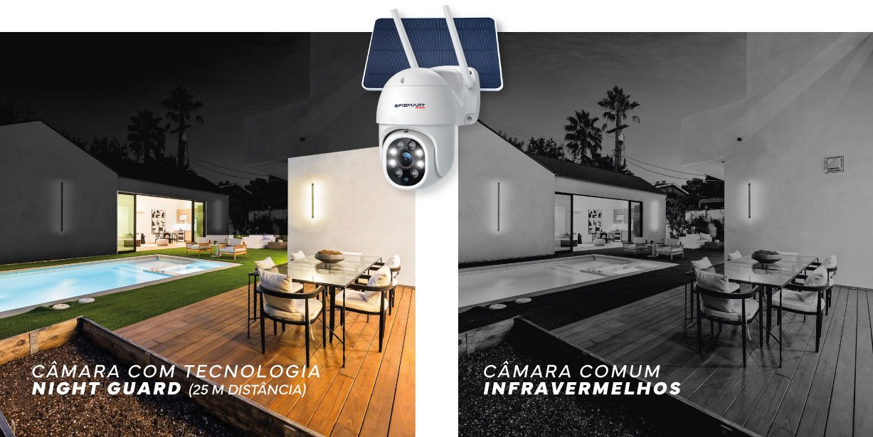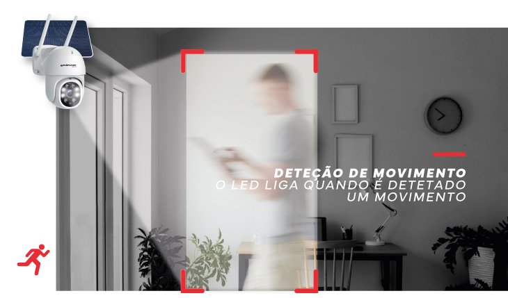 A câmara detecta qualquer movimento, iluminando automaticamente a área para garantir vigilância constante e proteção imediata, prevenindo potenciais ameaças e dissuadindo ações indesejadas.
