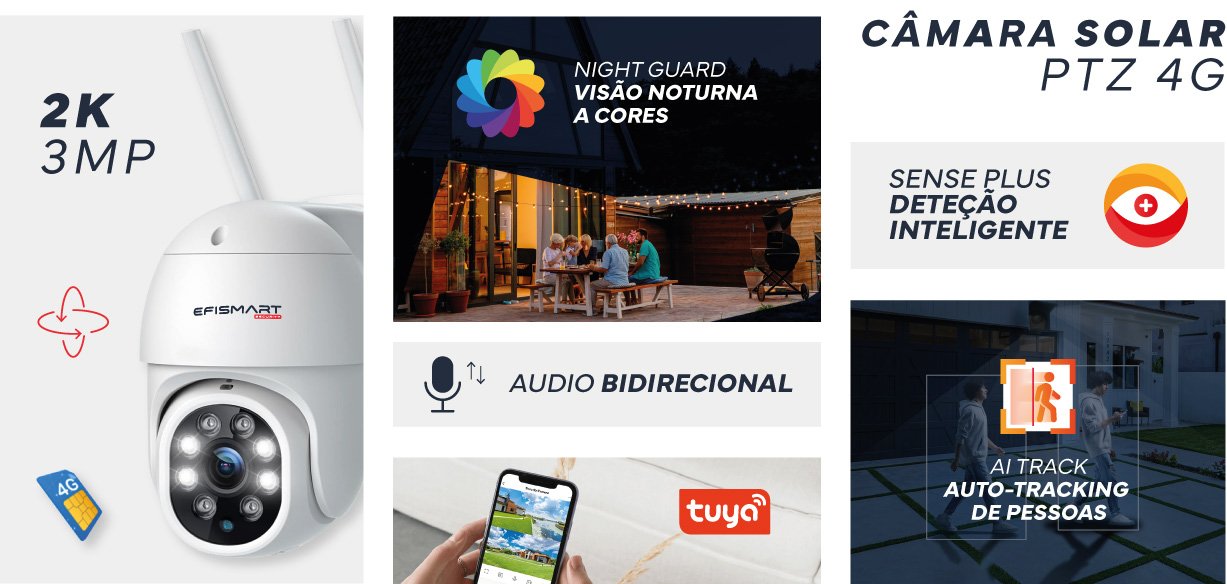 Câmara Vigilância 4G PTZ 3MP AI C/Painel Solar | Tuya