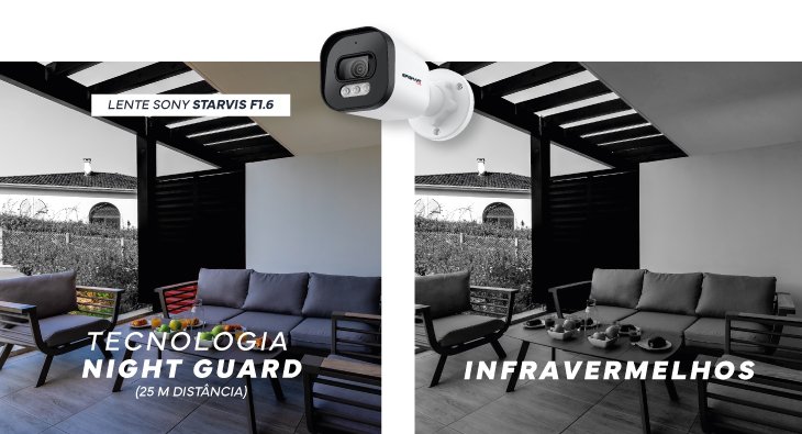 | Visão Nocturna Inteligente | Cores – Detecção Pessoas; Luz IR – Sem Pessoas; Alcance – 25 metros |