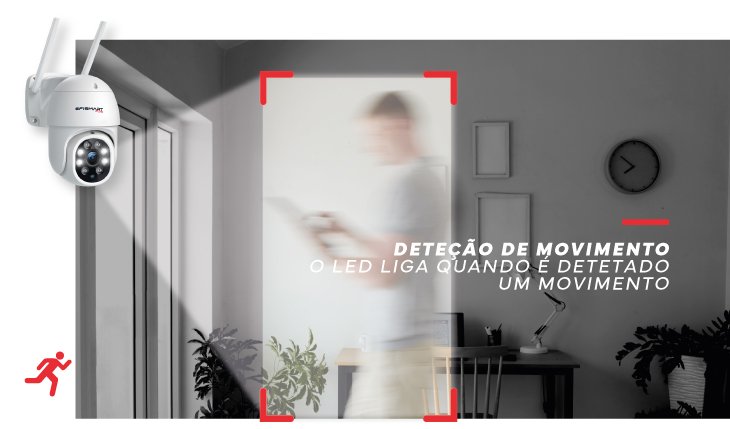 A câmara detecta qualquer movimento, iluminando automaticamente a área para garantir vigilância constante e proteção imediata, prevenindo potenciais ameaças e dissuadindo ações indesejadas.