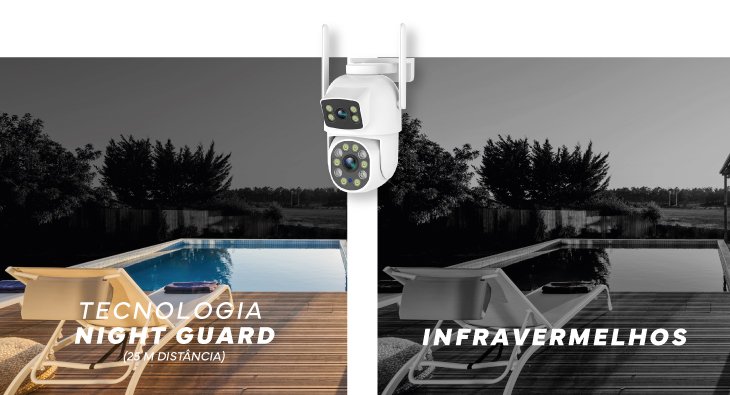 A câmara detecta qualquer movimento, iluminando automaticamente a área para garantir vigilância constante e proteção imediata, prevenindo potenciais ameaças e dissuadindo ações indesejadas.