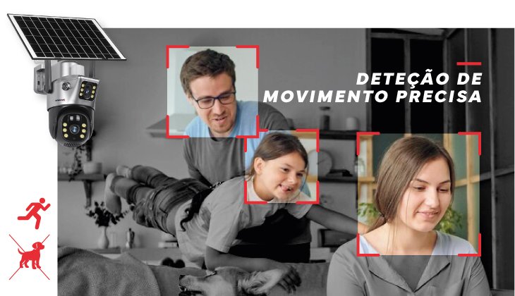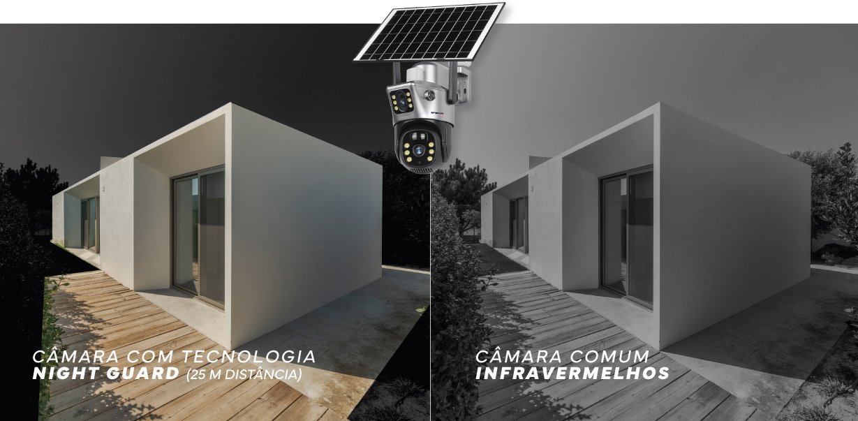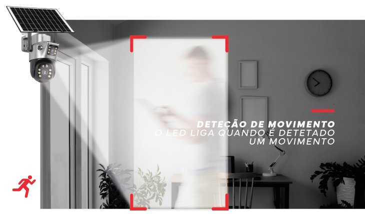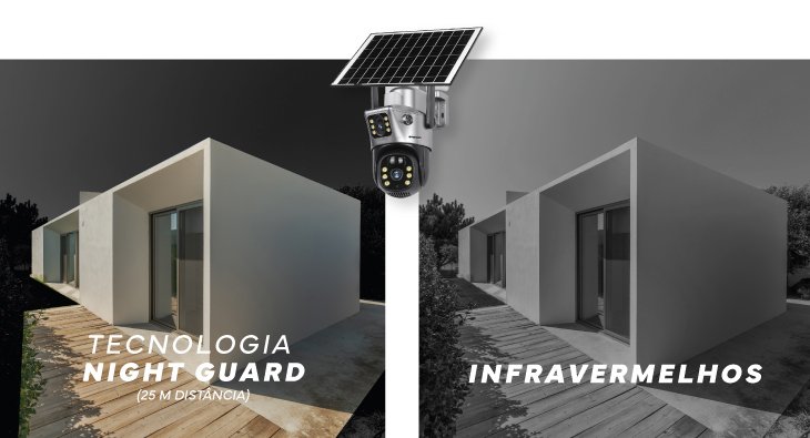 A câmara detecta qualquer movimento, iluminando automaticamente a área para garantir vigilância constante e proteção imediata, prevenindo potenciais ameaças e dissuadindo ações indesejadas.