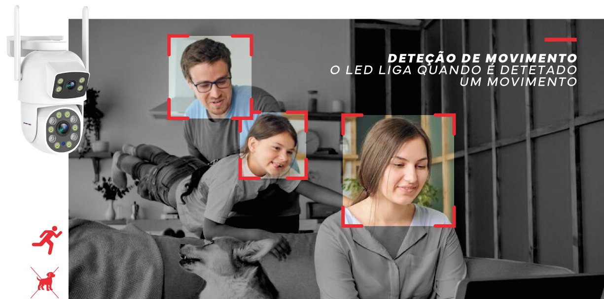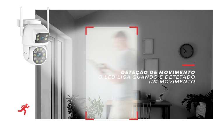 A câmara detecta qualquer movimento, iluminando automaticamente a área para garantir vigilância constante e proteção imediata, prevenindo potenciais ameaças e dissuadindo ações indesejadas.