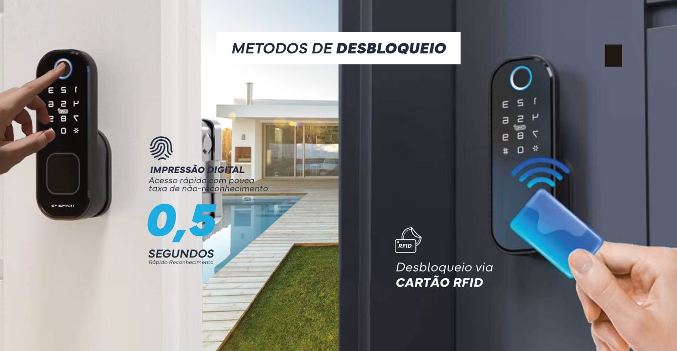 | Métodos de Desbloqueio | Aplicação, Cartão, Chave Mecânica, Código, Impressão Digital |