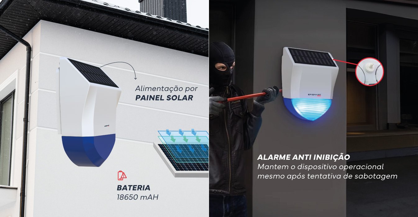 A Sirene Exterior C/Painel Solar ZIGBEE emite alertas audíveis em caso de emergência, dissuadindo intrusões e alertando vizinhança e serviços de segurança. Reforça a eficácia do sistema de segurança.