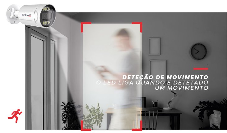 A câmara detecta qualquer movimento, iluminando automaticamente a área para garantir vigilância constante e proteção imediata, prevenindo potenciais ameaças e dissuadindo ações indesejadas.