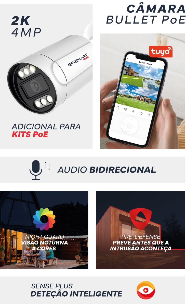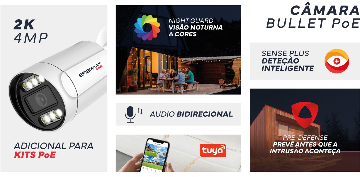 Sistema CCTV POE – 4x Câmara Bullet 4MP C/Deteção Movimento/Visão Nocturna + Gravador POE 4CH/IP 10CH 4K | Tuya