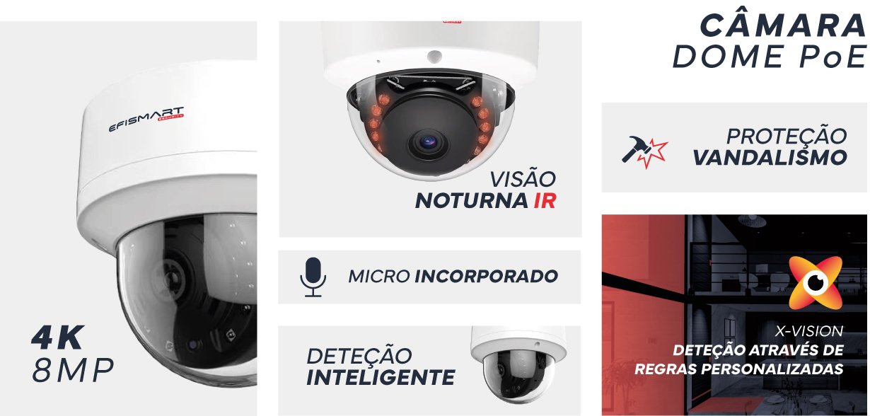 Gravações acionadas por movimento ou programadas, armazenadas em Gravadores NVR. Com compressão H.264/H.265, pode guardar vídeos de alta qualidade de forma eficiente. Se precisar de mais espaço ou de gerir várias câmaras, basta conectar a um sistema Efismart compatível para um armazenamento prolongado e de fácil controlo.