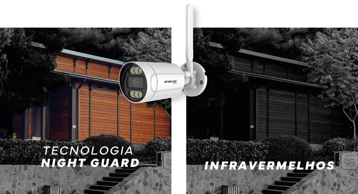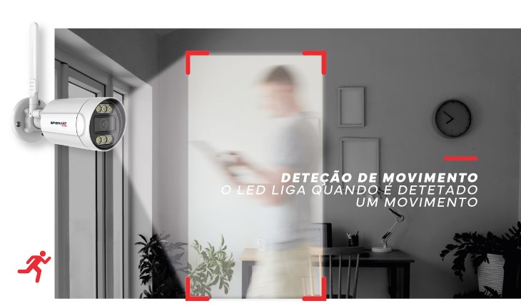 A câmara detecta qualquer movimento, iluminando automaticamente a área para garantir vigilância constante e proteção imediata, prevenindo potenciais ameaças e dissuadindo ações indesejadas.